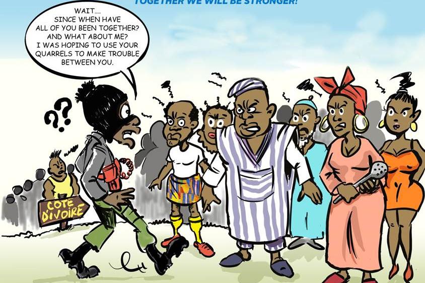 ONUCI Tour in Zeitouo: local people, not wanting to miss anything, crowded inside and outside the hut during UNOCI’s sensitization session against female genital mutilation (Zeitouo, near Toulepleu March 2016)