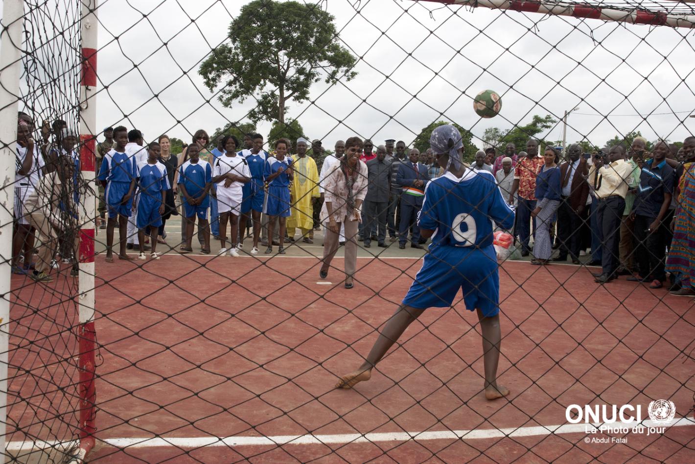 The Special Representative tries her skills at handball during the inauguration of the Agnibilekrou multi-sports complex financed by UNOCI under the Mission’s Quick Impact Project Programme (July 2016)