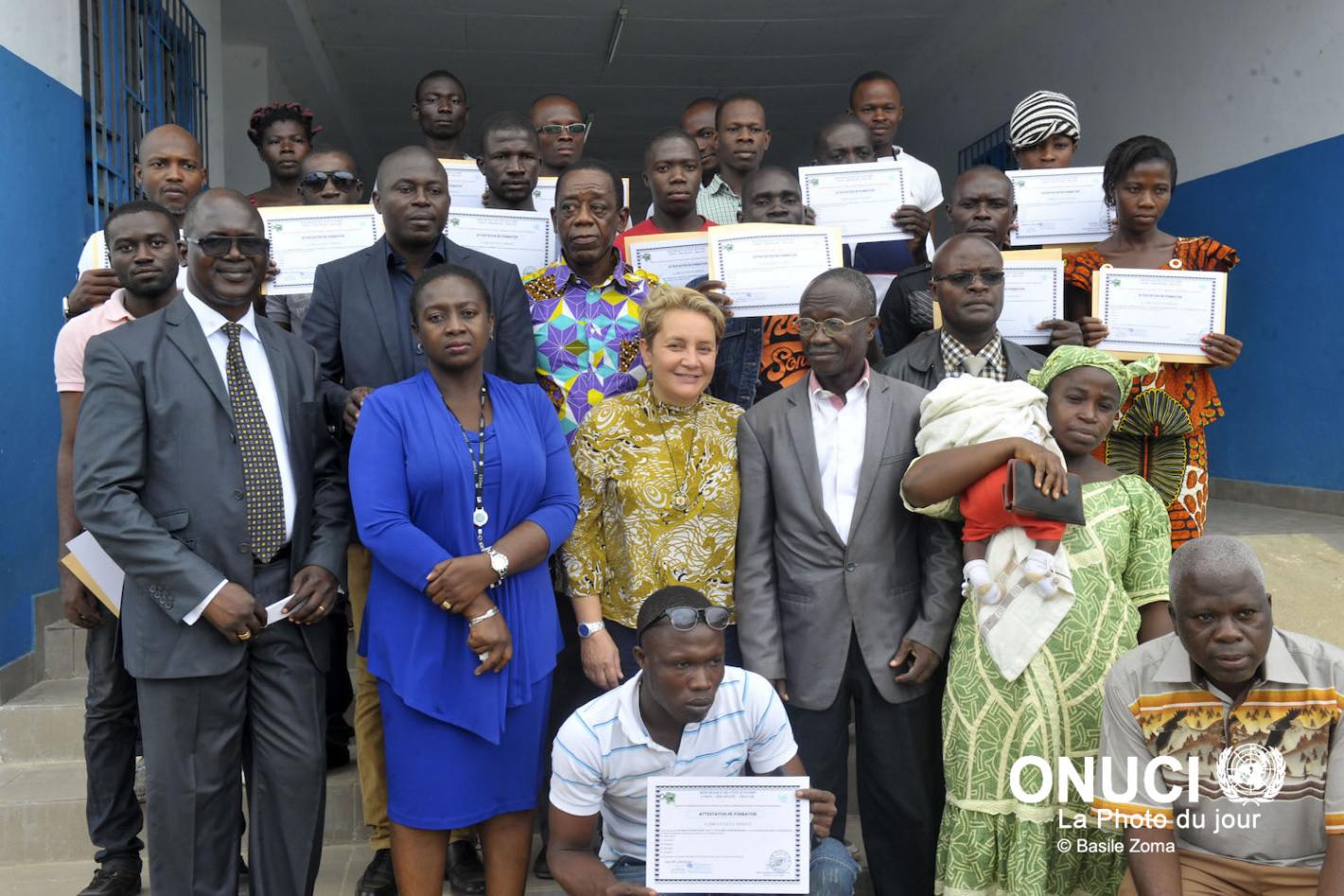 Ex-combatants received training certificates in masonry, carpentry, electricity and plumbing from the UNOCI Disarmament, Demobilization and Reinsertion Division (DDR), at the end of a programme financed by the UN Mission…