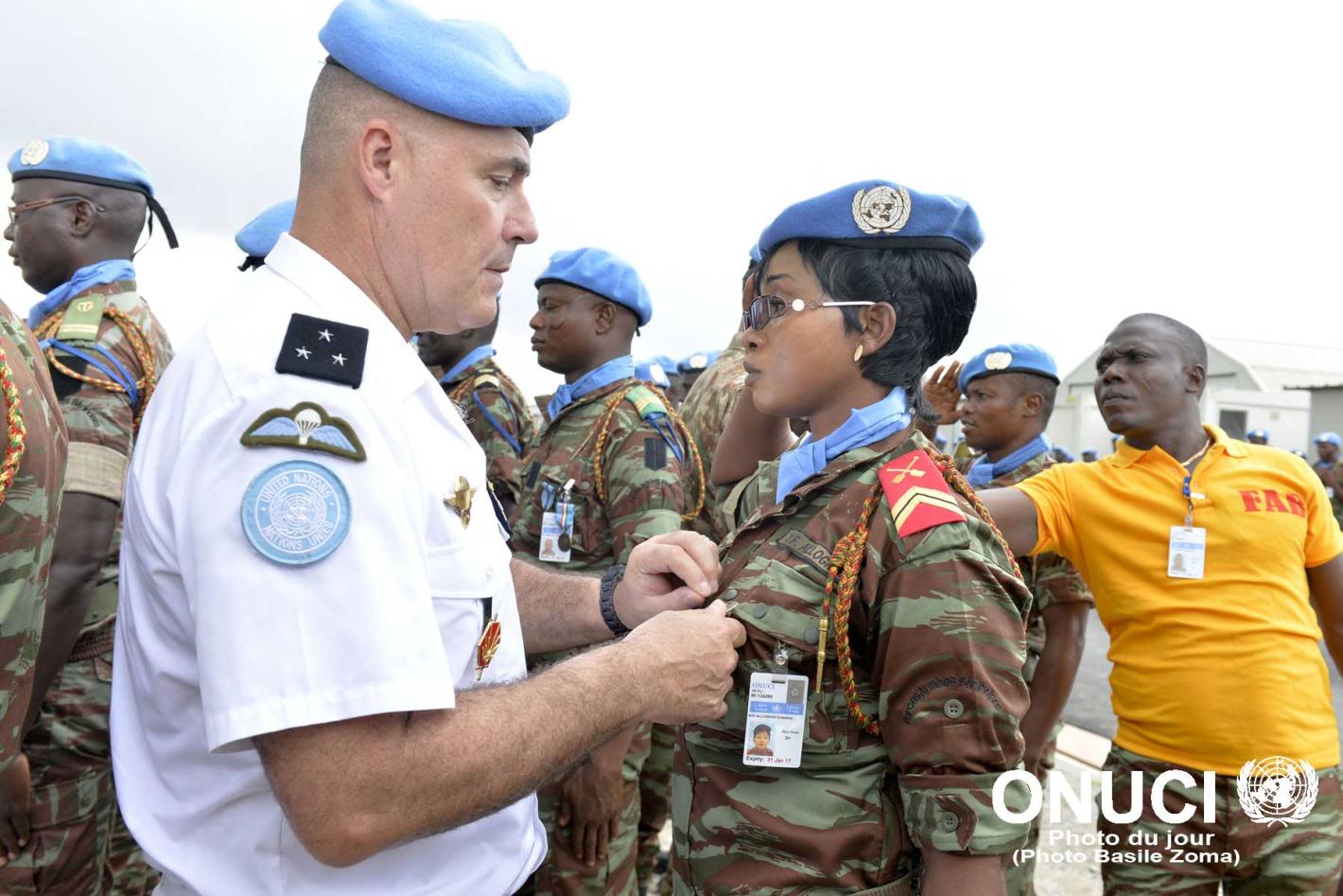 UNOCI Force Commander, General Didier L'Hôte decorates a female peacekeeper from the Benin Contingent with the UN Medal for good and loyal service to the United Nations Mission in Cote d'Ivoire (Abidjan, May 2016)