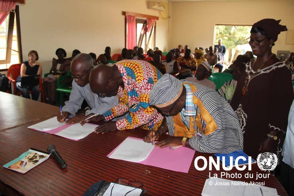Community leaders in Danane signing recommendations at the end of an UNOCI-sponsored workshop on the prevention of rural land ownership conflicts (Danane, June 2016)
