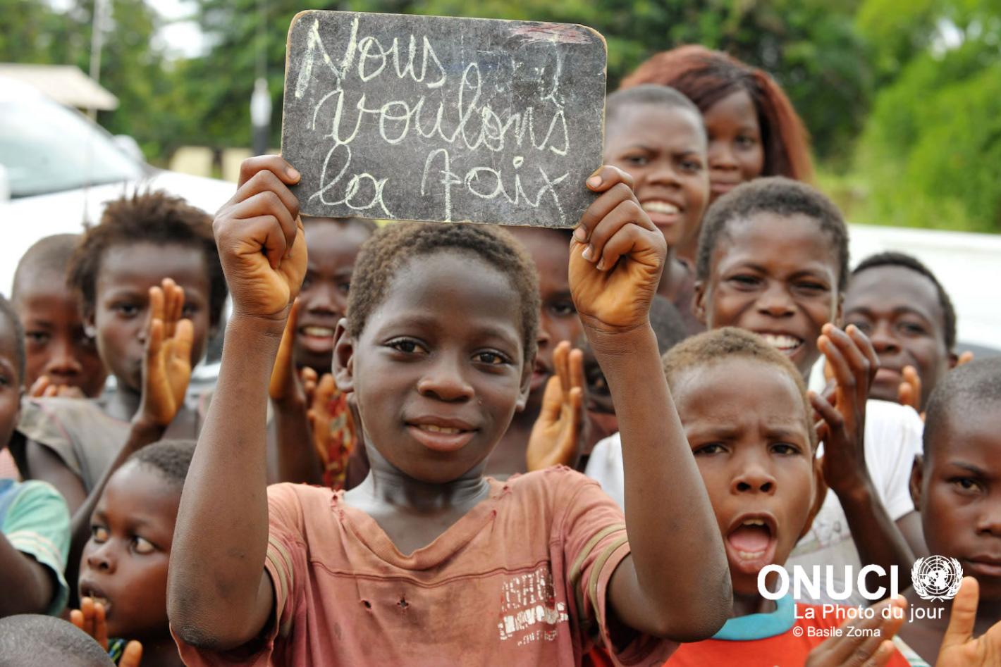 Children of the village of Diahouin, near Blolequin want peace. They made it clear to a visiting UN delegation following the post-electoral crisis (Diahouin, June 2011)