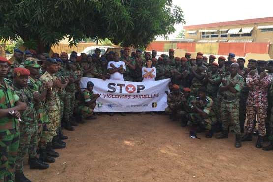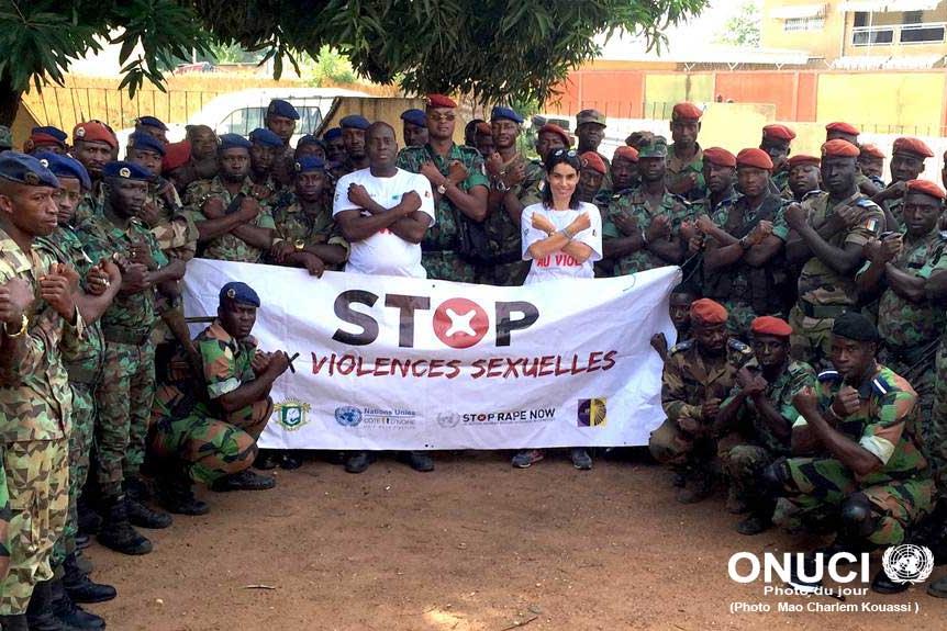 Republican Forces of Côte d’Ivoire hold banner saying no to sexual violence at the end of a sensitisation session organized by UNOCI and the FRCI General Staff Office (Boundoukou, May 2016)