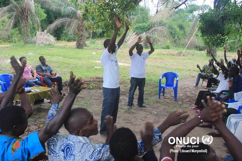 Participants at the sensitisation session on social cohesion and peaceful in Grie 1, in the Department of Toulepleu responded by a resounding ‘’ yes’’ to the question: ‘’Who wants peace ?’’ (Grie 1, May 2016)
