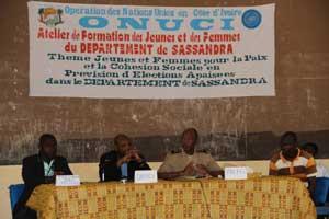 A San Pedro, ville portuaire située à 368 km au sud-ouest d'Abidjan, les jeunes et les femmes de la région ont également travaillé en atelier pour leur contribution en faveur de la réconciliation nationale et de la consolidation de la paix. Le Coordonnateur du Système des Nations Unies à San Pedro, Ganda Abdourahamane, conduisant la délégation de la Mission, s'est adressé aux jeunes, les mettant face à leurs responsabilités. Il leur a demandé de laisser tomber la logique de la violence et de développer la paix, car, leur a-t-il dit, « la Côte d'Ivoire de demain vous appartient et pour réaliser vos rêves, il faut que cet espace demeure ».