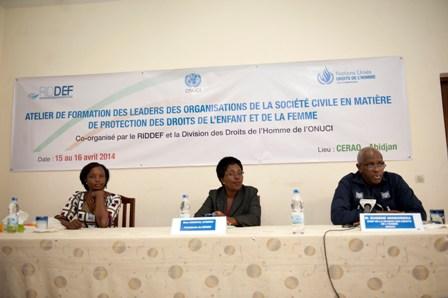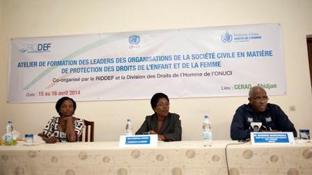 La Division des Droits de l'Homme (DDH), de l'Opération des Nations Unies en Côte d'Ivoire (ONUCI) et le Réseau Ivoirien pour la Défense des Droits de l'Enfant et de la Femme (RIDDEF) organisent, depuis ce mardi 15 avril 2014, un atelier de renforcement des capacités des leaders de la société civile en matière de protection des droits de l'enfant et de la femme.