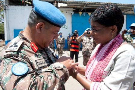 partout dans le monde. « Je voudrais féliciter les récipiendaires et profiter de cette occasion pour adresser ma gratitude au contingent Jordanien. Les Nations Unies attachent un grand prix aux efforts accomplis par ceux qui portent la tenue des Casques bleus pour la restauration de la paix et de la sécurité dans le monde », a fait savoir Mme Mindaoudou. Selon la Représentante spéciale, cette médaille avait pour objectif de motiver le contingent Jordanien à continuer à travailler inlassablement pour accomplir les nobles objectifs des Nations Unies que constituent la paix et la sécurité.