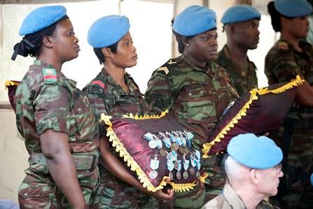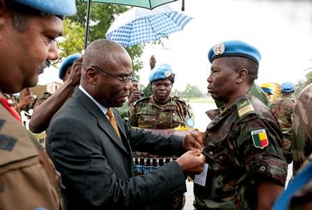 Le Représentant spécial adjoint du Secrétaire général des Nations Unies pour la Côte d'Ivoire, Arnauld Akodjènou, en présence d'une délégation militaire béninoise, ayant à sa tête, l'Amiral Denis Hounsou Gbessemehlau, Chef d'Etat-major des Forces armées béninoise, et de l'Ambassadeur du Bénin en Côte d'Ivoire, M. Daouda Wabi, a remis, ce vendredi 9 mai 2014, la médaille des Nations Unies aux soldats du 19e Contingent béninois (BENINBATT) de la Mission onusienne au camp d'Akouédo à Abidjan.