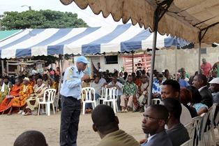 La caravane de sensibilisation de proximité de l'Opération des Nations Unies en Côte d'Ivoire (ONUCI), a marqué une halte, ce mercredi 5 novembre 2014, au village d'Anoumabo de la commune de Marcory, dans le district autonome d'Abidjan.