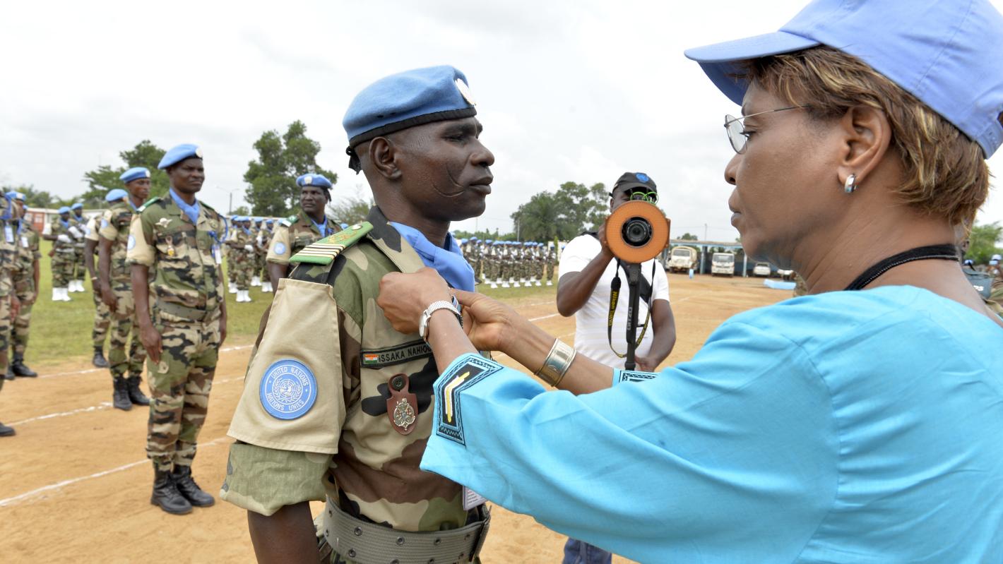 Six cent cinquante Casques bleus du 23e Bataillon du Niger décorés par la Représentante spéciale avant leur départ définitif de Tabou et de la Côte d'Ivoire