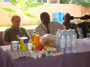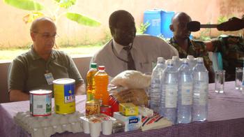 Le Dr. Kisamba, chef de l'unité médicale de l'ONUCI dans le secteur Est, par ailleurs initiateur de cette cérémonie, a procédé ensuite à la remise des dons : « Cette journée est placée sous le signe de la fraternité et du partage [...] ainsi, j'aimerais vous remettre ces dons qui proviennent de contributions volontaires du personnel de l'ONUCI ». Ces dons, constitués d'eau potable, des produits alimentaires, ainsi que de produits détergents ont été remis symboliquement aux bénéficiaires qui ont exprimé toute leur gratitude à l'endroit de l'ONUCI.