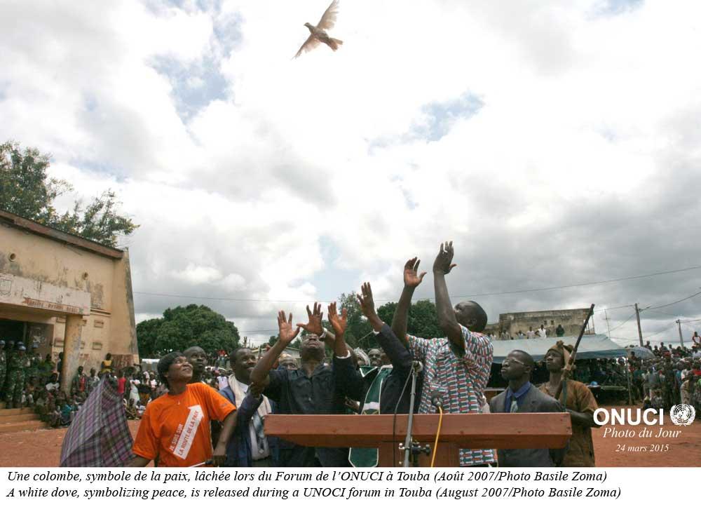 - Une colombe, symbole de la paix, lâchée lors du Forum de l’ONUCI à Touba (Août 2007/Photo Basile Zoma)