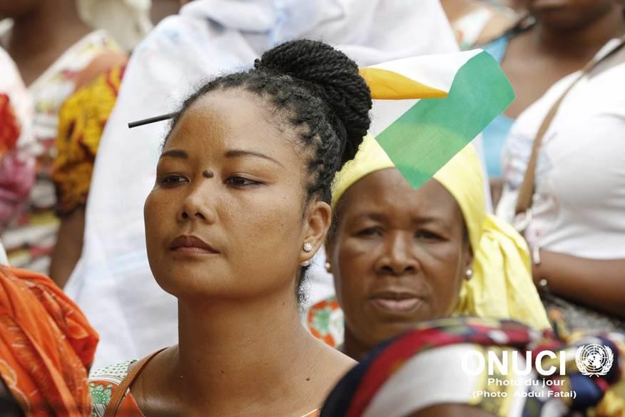 Journée internationale de la Femme : avec pour ornement dans ses tresses le drapeau ivoirien, cette femme suit attentivement les allocutions lors de cérémonie officielle à laquelle a participé aussi la Chef de l’ONUCI…