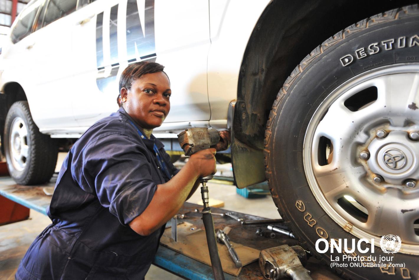 En voilà une, mécanicienne au sein de la section Transports de l’ONUCI, qui ne craint pas le cambouis et accomplit sa tâche avec dévouement (Abidjan, juillet 2012)