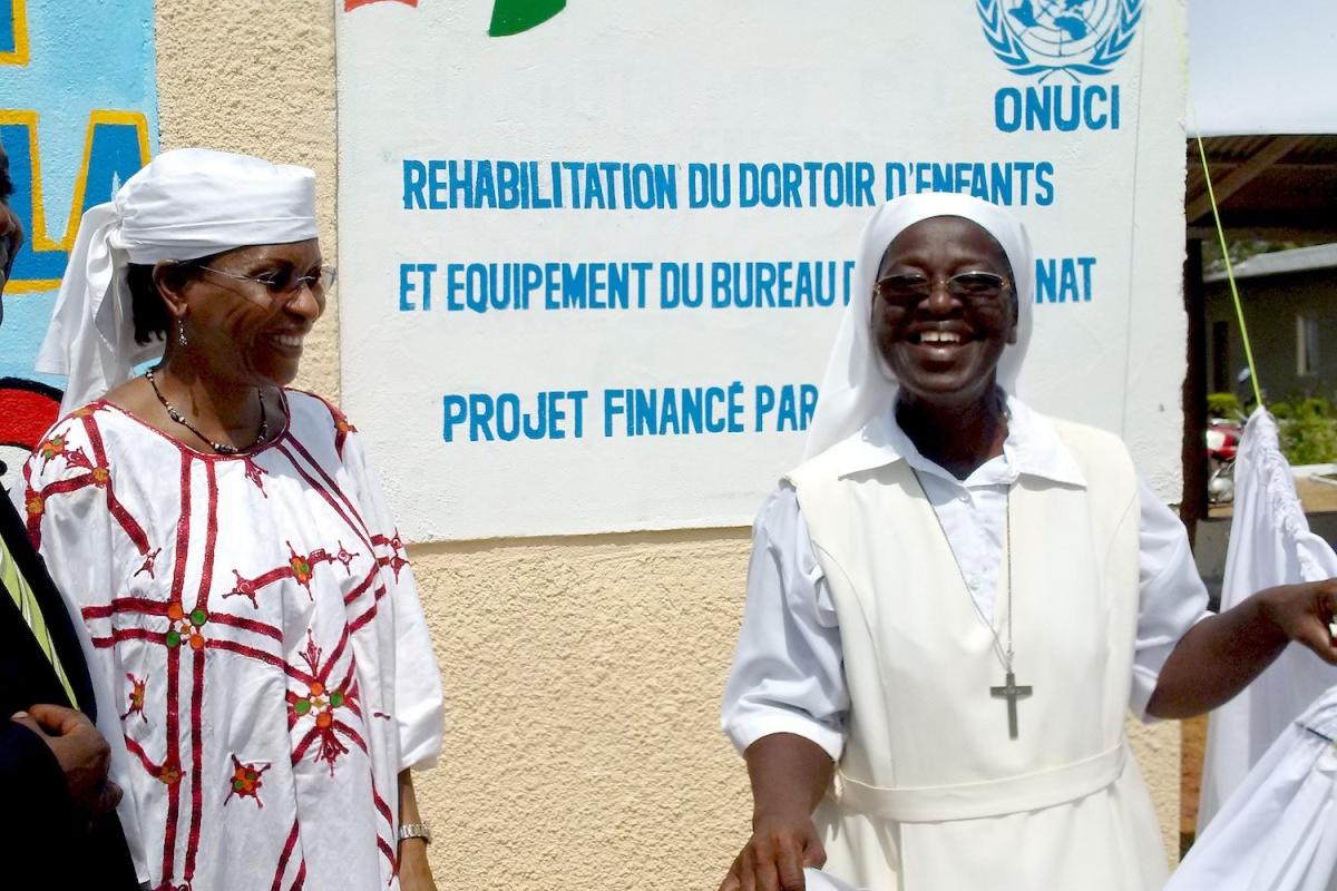 Projet à impact rapide de l’ONUCI : la Directrice de l’orphelinat ‘’ La Casa Del Sol’’ exhibe quelques pas de danse pour remercier l’ONUCI d’avoir rénové l’établissement (Tabou, mars 2016)