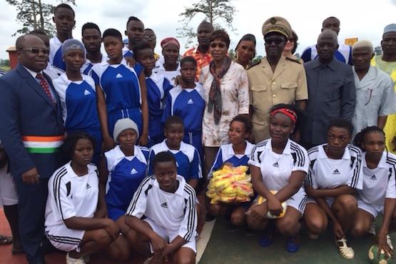 La Représentante spéciale s’essaye au handball lors de l’inauguration du Complexe multisport d’Agnibilekrou, financé par l’ONUCI, dans le cadre de son programme de Projets à impact rapide (juillet 2016)